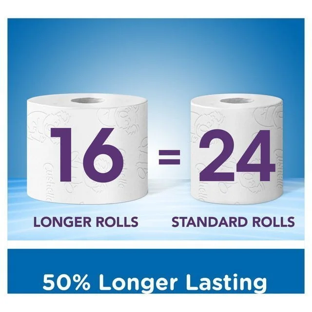 Original Flavor Toilet Paper, 16 rolls, 50% longer than standard rolls*. Cushelle Original Flavor Toilet Paper uses microbubble technology for a soft touch and high absorbency, providing a comfortable and clean experience with every use. Now with longer rolls, you’ll use less—and it really does!